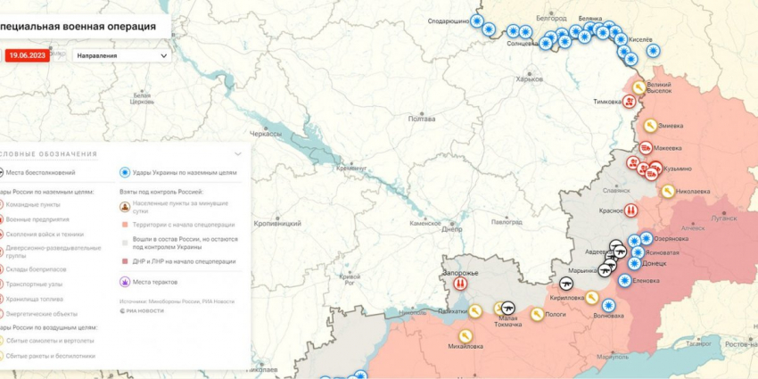 23. Карта боевых действий на Украине, к утру 20 июня 2023г., от РИА Новости. Карта специальной военной операции.