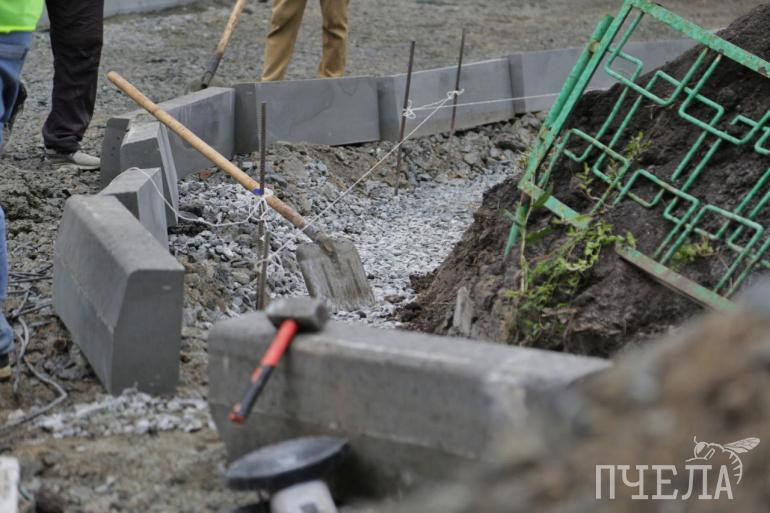 Рабочие устанавливают бортовые камни — разделители между проезжей частью и тротуаром