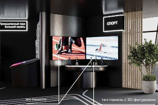 Зона “Спорт”. Спортивные проекты и объекты края будут показаны через тач-экран с помощью 3D-статуэток ключевых фигур этой сферы. Если поставить фигурку на тач-панель, можно будет увидеть краткую биографию человека и информацию о спортивном объекте, к которому он имеет отношение: система сама распознает, какая фигурка стоит на экране. Статуэтки людей могут быть заменены на здания или спортивную атрибутику. Варианты фигурок и проектов: керлингистка керлинг-центра, хоккеист регионального центра по хоккею, боксер центра бокса, гимнастка центра спортивной и художественной гимнастики, пловец центра водных видов спорта, атлет легкоатлетического манежа.