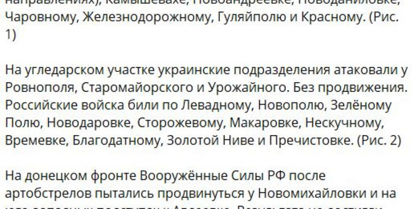 ВСУ на Угледарском участке атаковали в районах Ровнополя, Старомайорского и Урожайного, продвинуться не сумели. На Донецком фронте российские войска вели наступление у Новомихайловки и на юго-западных подступах к Авдеевке. Кроме того, военкор Семен Пегов сообщает о контратаке ВС РФ у Орехово-Василевки на Артемовском направлении.