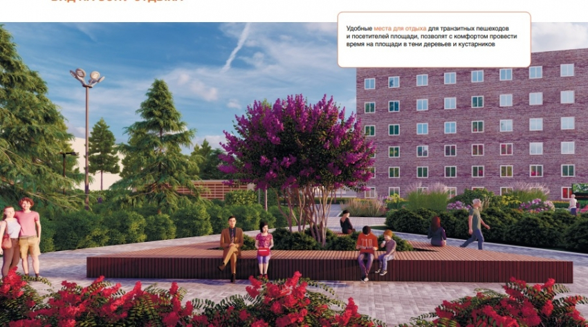 Вот что предлагают сделать дизайнеры на центральной площади. За памятником Борцам за власть Советов вместо чаш с фонтанами установить большой “сухой” пешеходный фонтан. Для отдыха людей обустроить специальную зону, а также сделать теневой навес с качелями со стороны улицы Октябрьской. Асфальтированная часть на площади по замыслам разработчиков сократится: асфальт заменит брусчатка.