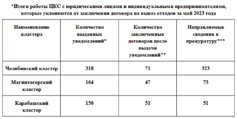 Больше всего нарушителей обнаружено в муниципалитетах, входящих в состав Челябинского кластера. Там за время выездной работы в мае нарушителям природоохранного законодательства вручили 318 уведомлений о необходимости заключить договор на вывоз коммунального мусора. В Магнитогорском кластере вручено 164 подобных уведомления, в Карабашском — 150.