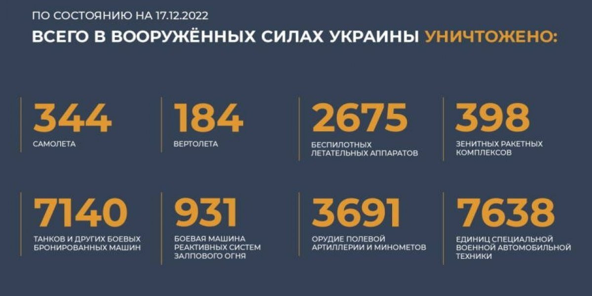 17 декабря Минобороны РФ сообщило, что вооруженные силы России нанесли массированный ракетный удар по объектам Украины. В результате была сорвана переброска оружия и боеприпасов иностранного производства, а также блокировано выдвижение резервов ВСУ в районы боевых действий. В российском военном ведомстве сообщили, что удар нанесен высокоточным оружием большой дальности воздушного и морского базирования, цель удара достигнута, а все назначенные объекты поражены. Источник