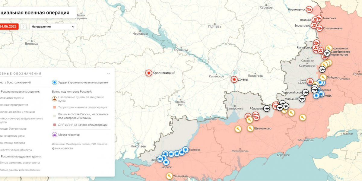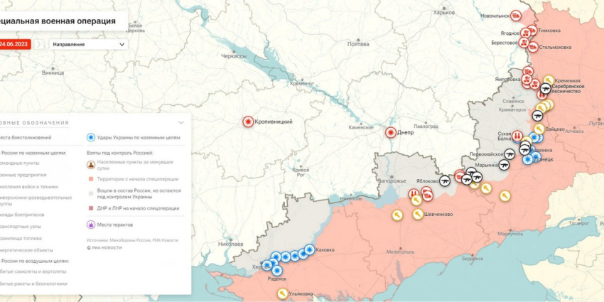 19. Карта боевых действий на Украине, к утру 25 июня 2023г., от РИА Новости. Карта специальной военной операции.