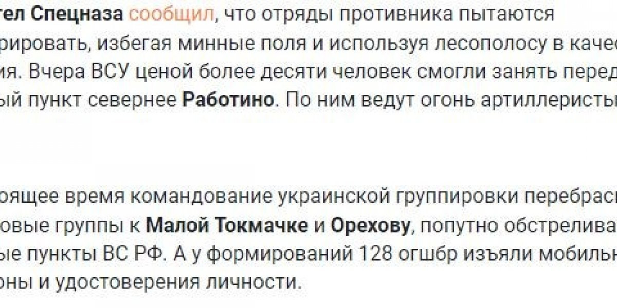 Запорожское направление: в районе Пятихаток идут ожесточенные бои. На Ореховском участке враг не предпринимал активных действий, российские бойцы крепко держат свои позиции. На Времьевском выступе продолжаются бои при активной работе артиллерии.