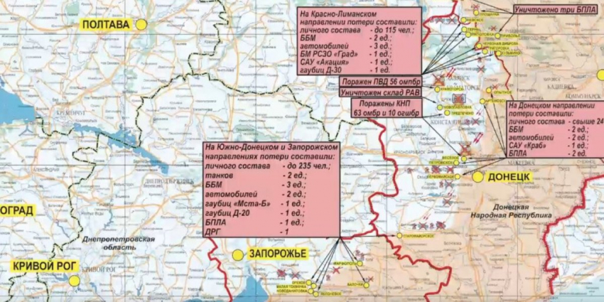 В районе Времевского выступа Россия отразила две атаки украинской стороны силами мотопехотной роты. Две атаки были отражены на Краснолиманском направлении, также пресечена попытка прорыва двух диверсионных группировок.