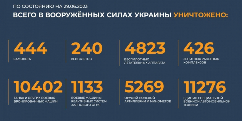 Всего с начала проведения специальной военной операции уничтожено: 444 самолета, 240 вертолетов, 4823 беспилотных летательных аппарата, 426 зенитных ракетных комплексов, 10402 танка и других боевых бронированных машин, 1133 боевые машины реактивных систем залпового огня, 5269 орудий полевой артиллерии и минометов, а также 11276 единиц специальной военной автомобильной техники.