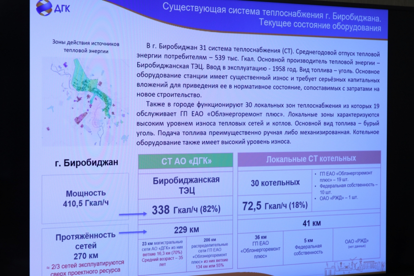 “Всего в Биробиджане сейчас 30 котельных, из них 19 обслуживает “Облэнергоремонт плюс”, 10 находятся в федеральной собственности, одна подчиняется ОАО “РЖД”. Общее состояние оборудования оценивается как “существенный износ”. Мы готовы взять в обслуживание все эти котельные. По плану, часть из них будет ликвидирована, часть продолжит эксплуатацию с последующей модернизацией и переключением на другие источники”, — рассказал директор по развитию теплового бизнеса АО “ДГК” Дмитрий Богдановский.