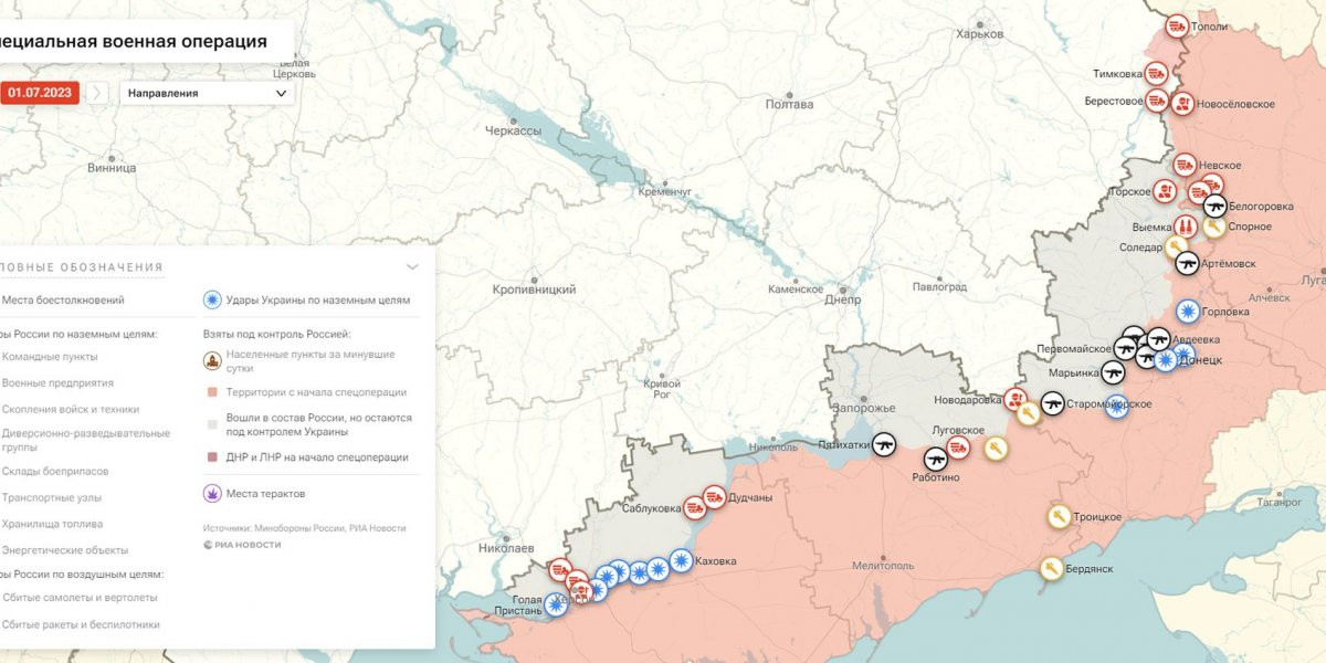 - Карта боевых действий на Украине, к утру 2 июля 2023г., от РИА Новости. Карта специальной военной операции.
