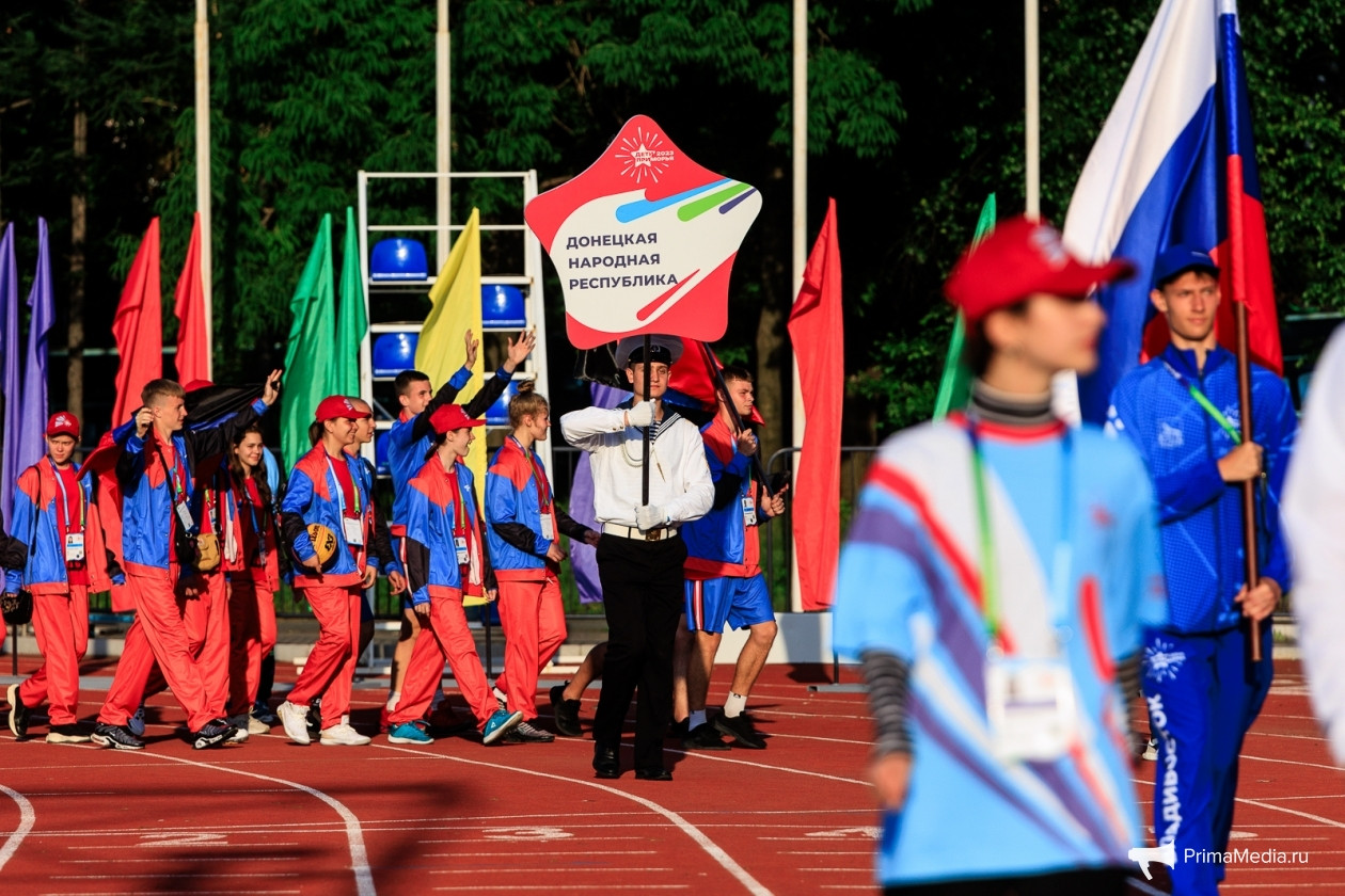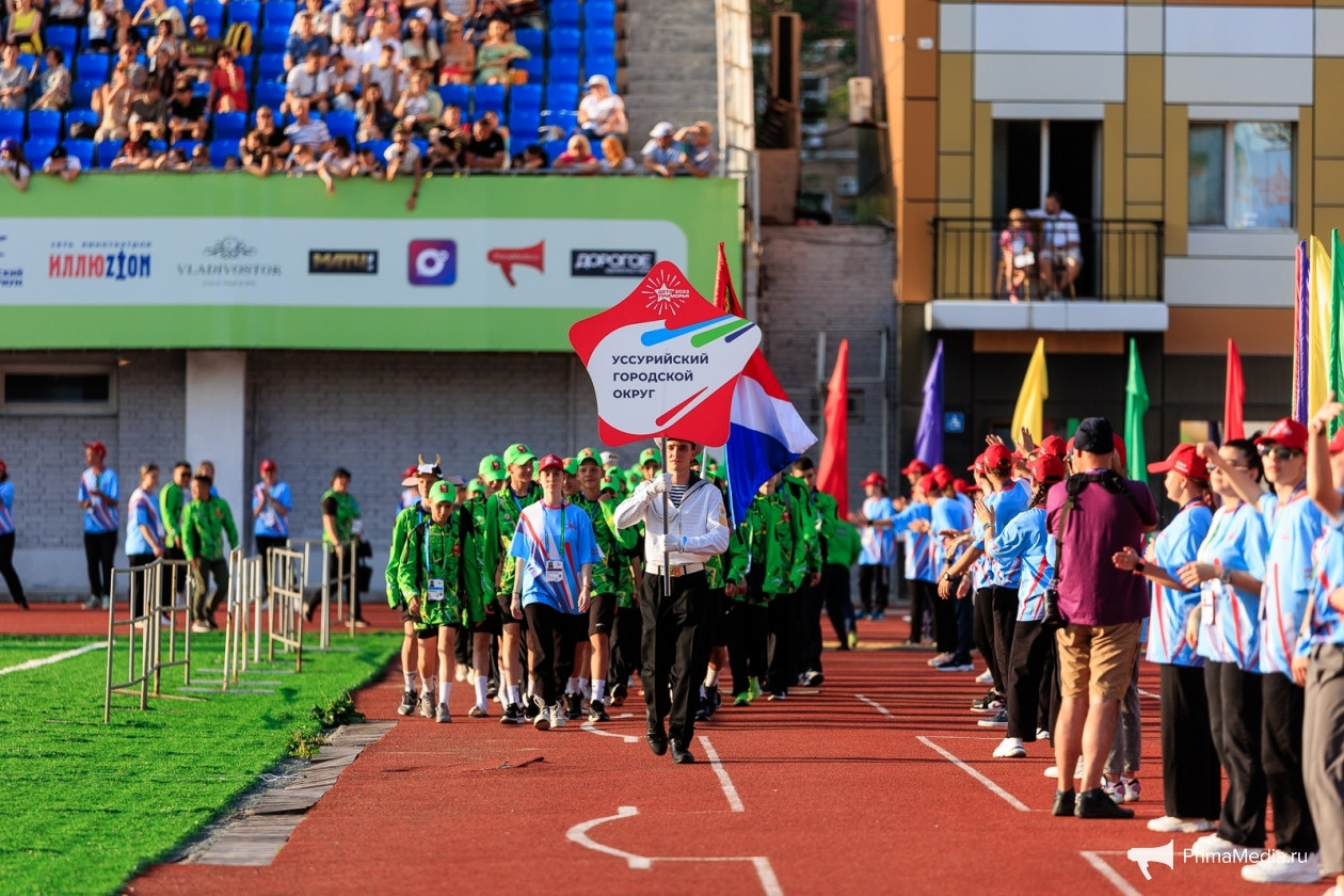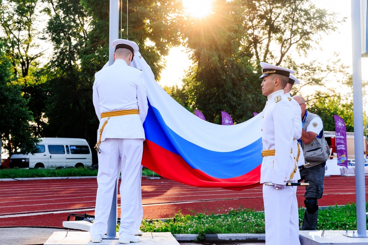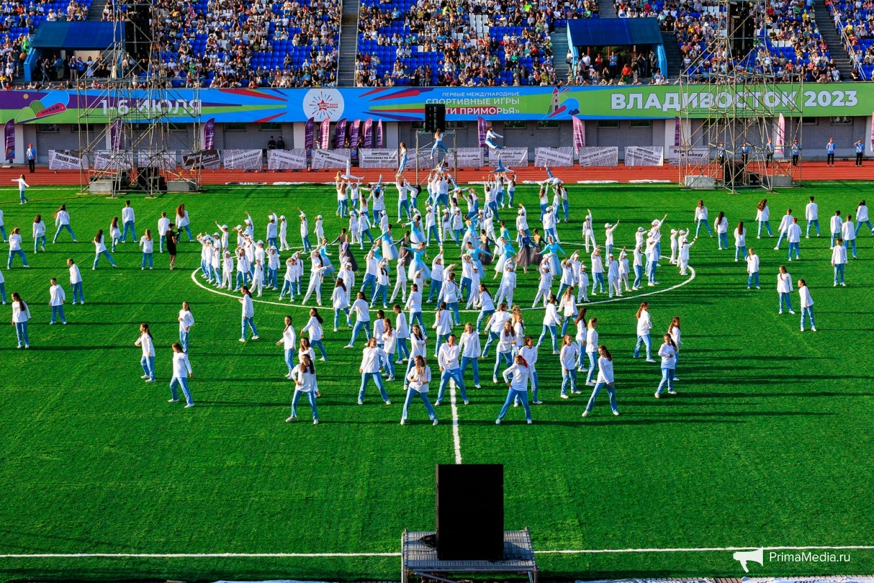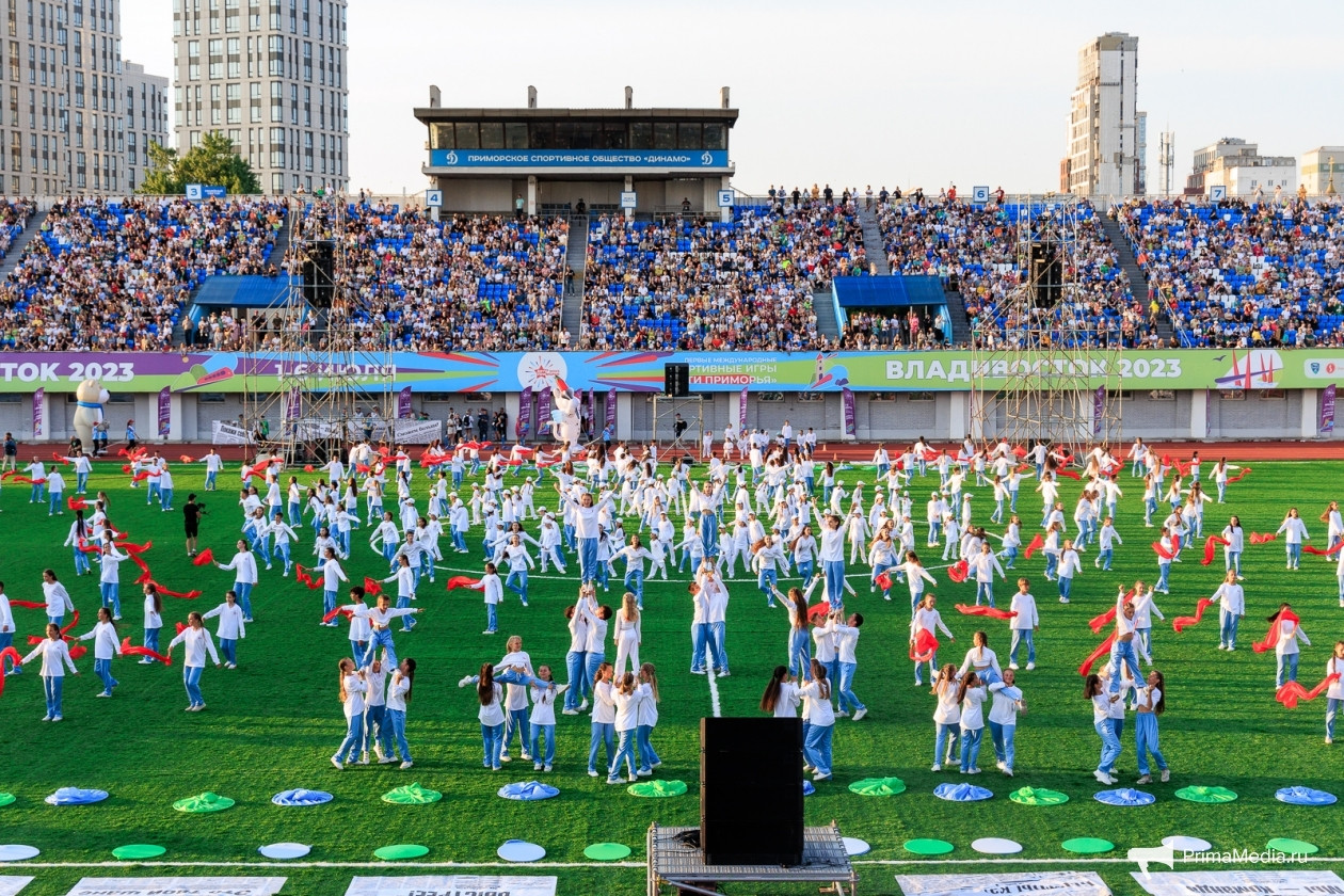 К вечеру праздник постепенно переместился на стадион “Динамо”, где весь день шли соревнования в рамках первых летних международных спортивных игр “Дети Приморья”. Здесь тысячи горожан и юных спортсменов собрались на торжественную церемонию открытия игр.