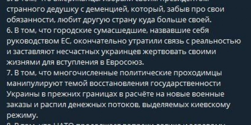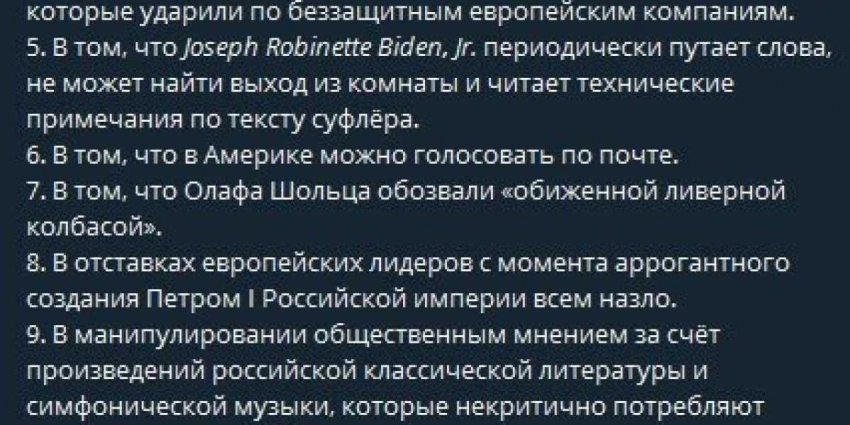 В список также вошли зашкаливающие цены в США и их ближайших союзников, высмеял Байдена и вспомнил оскорбление «обиженной ливерной колбасой»,канцлера Германии Олафа Шольца,