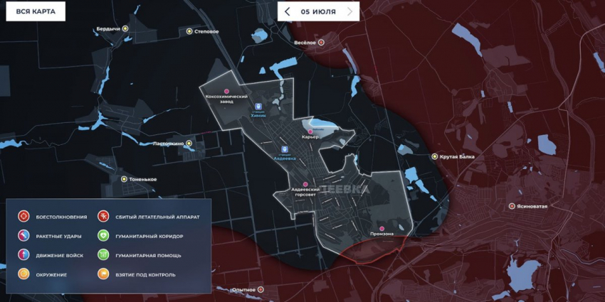 - Карта боевых действий на Украине сегодня, обстановка 5 июля 2023 года от Mash. Бои за Авдеевку