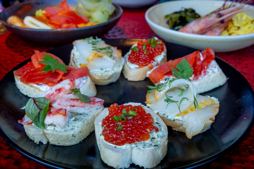 Ну и какой же завтрак без бутербродов? Они у шефа тоже не обычные, а дальневосточные — с фалангой камчатского краба, малосольной неркой, красной икрой и палтусом холодного копчения. Ещё больше “морского” вкуса придают бутербродам водоросли, смешанные с маслом.