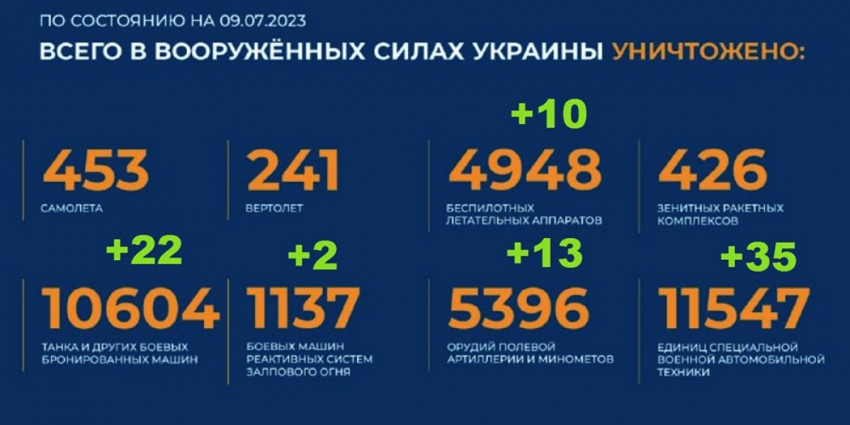 - Актуальный брифинг Министерства обороны РФ о ходе проведения специальной военной операции на территории Украины по состоянию на 9 июля 2023 года. Сводка боевых действий на Украине.