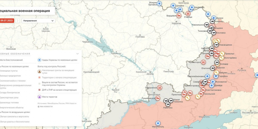 - Карта боевых действий на Украине, к утру 10 июля 2023г., от РИА Новости. Карта специальной военной операции.
