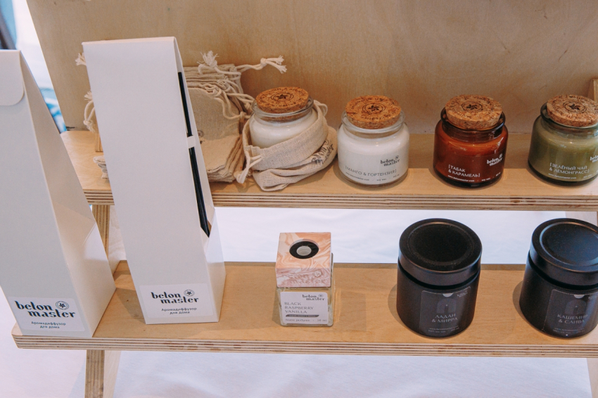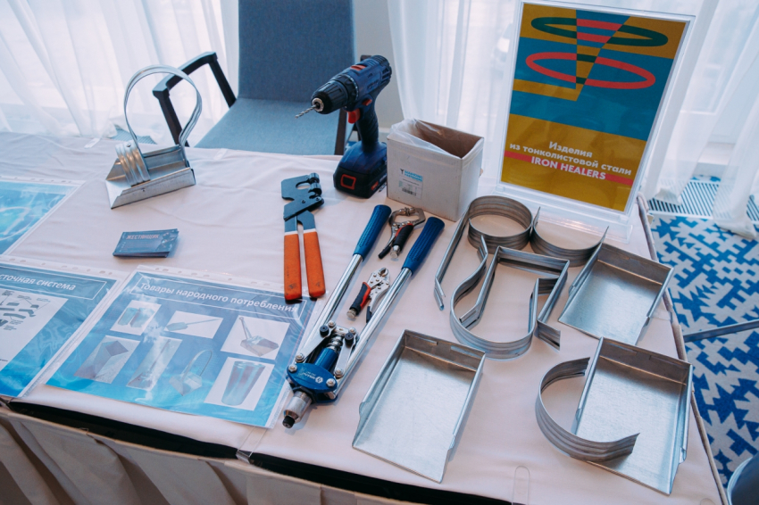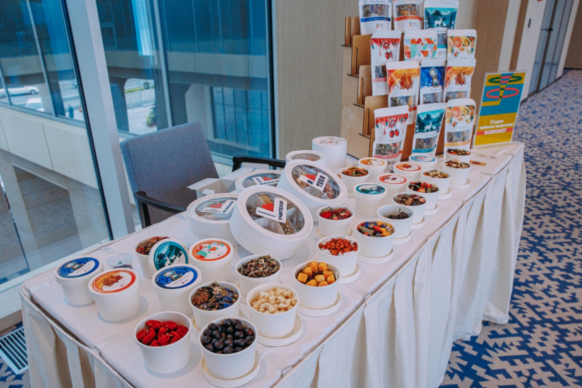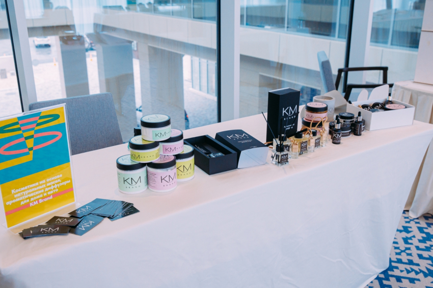 В течение всего дня в холле отеля работала также выставка продукции молодых предпринимателей. Здесь можно было познакомиться как с историей его создания, так и его характеристиками.