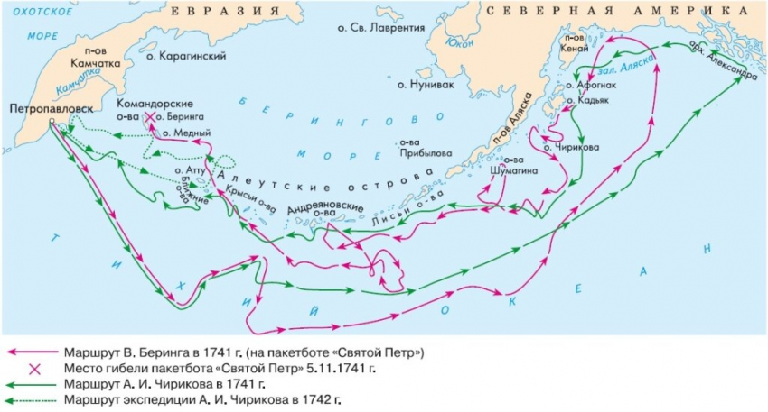 Летом 1740 года в Охотске под руководством корабельных мастеров Козьмина и Рогачёва, наконец, были построены два пакетбота: “Святой Пётр” и “Святой Павел”, на которых в сентябре 1740 года Беринг (“Святой Пётр”) и Алексей Чириков (“Святой Павел”) перешли к берегам Камчатки. В Авачинской бухте они заложили Петропавловский острог (ныне г. Петропавловск-Камчатский).