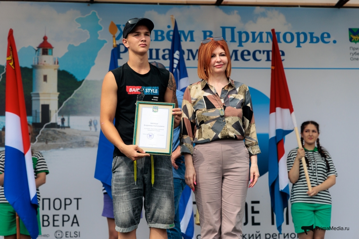В 16.00 стартовала официальная часть, предвещавшая раскрытие главной интриги дня — награждение победителей “Открытого моря”. Поздравить гостей праздника с Днем рыбака от лица губернатора Олега Кожемяко и себя лично приехала заместитель председателя правительства Приморского края — министр культуры и архивного дела Приморья Елена Бронникова. Также в честь открытия “Выставки достижений народного хозяйства” (0+) она вручила приветственный адрес от губернатора Олега Кожемяко главе Шкотовского муниципального района Владимиру Носову.