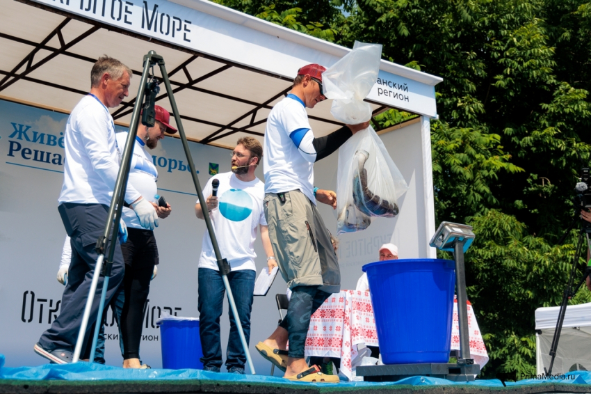 В это время участники “Открытого моря” уже стали прибывать со своим уловом и собираться возле сцены в ожидании контрольного взвешивания. Церемонию взвешивания под протокол провел председатель Федерации рыболовного спорта Приморского края. Свой улов судьям предъявили 13 команд. Надо отметить, что среди участников была команда, состоящая только из девушек, под названием “Пираньи”. Они наловили 7 кг рыбы. Умилительные улыбки, следивших за взвешиванием участников праздника, вызвала и команда “Дельфин и Русалка”, в которой были только двое — мужчина и женщина.
