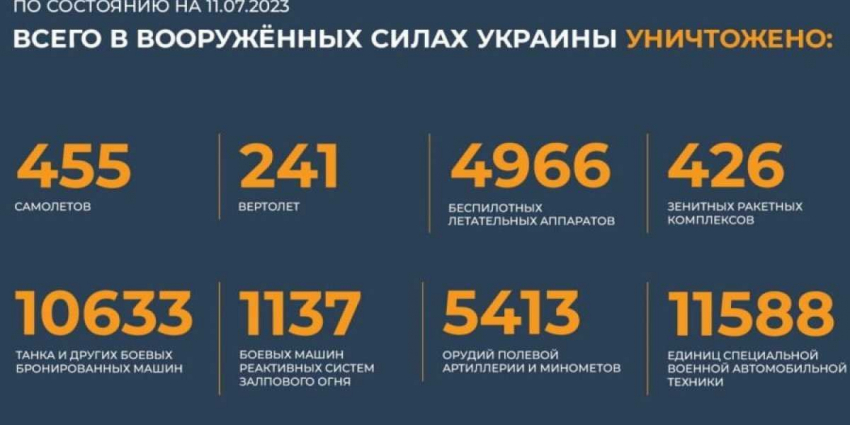 Всего с начала проведения специальной военной операции уничтожены: 455 самолетов, 241 вертолет, 4966 беспилотных летательных аппаратов, 426 зенитных ракетных комплексов, 10649 танков и других боевых бронированных машин, 1137 боевых машин реактивных систем залпового огня, 5413 орудий полевой артиллерии и минометов, а также 11592 единицы специальной военной автомобильной техники.