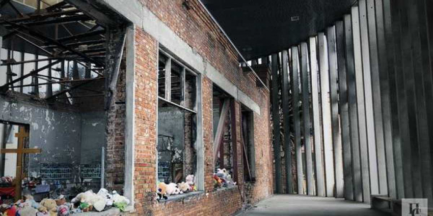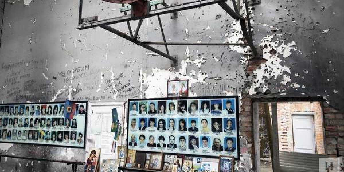 Пожалуй, в русском языке не найдется слов, чтобы описать чувства, которые испытываешь при входе в этот спортзал. Нечто похожее человек ощущает, впервые оказавшись в церкви в юном возрасте. В центре — массивный крест, вдоль стен — свечи и вручную сооруженные мемориалы. Но вместо еле уловимого религиозного таинства – давящая атмосфера и ужас, отражающийся в застекленных портретах погибших детей.