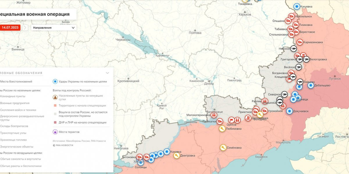 - Карта боевых действий на Украине, 14 июля 2023г., от РИА Новости. Карта специальной военной операции.