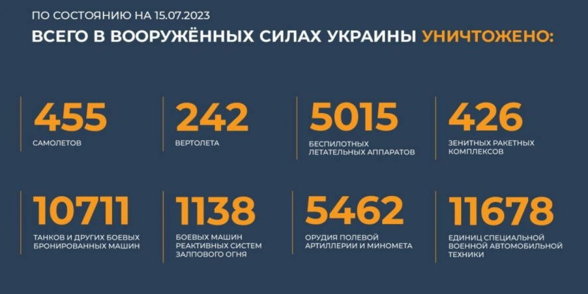 Потери Украины на сегодня 14.07.2023 Всего с начала проведения специальной военной операции уничтожено: 455 самолетов, 242 вертолета, 5009 беспилотных летательных аппаратов, 426 зенитных ракетных комплексов, 10700 танков и других боевых бронированных машин, 1138 боевых машин реактивных систем залпового огня, 5453 орудия полевой артиллерии и минометов, а также 11664 единицы специальной военной автомобильной техники