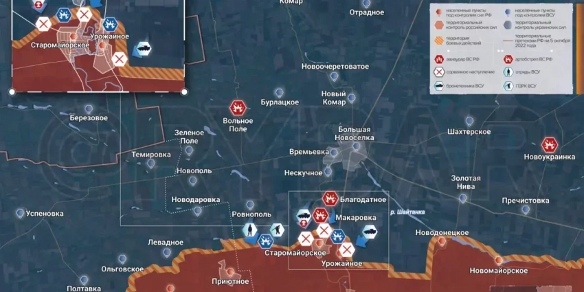 На Времьевском участке после того как подразделения противника смогли закрепиться у Балки Грушевой, внимание ВСУ вновь переместилось на рубеж Старомайорское — Урожайное.