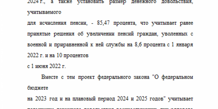 «Кроме того парламентарий обратил внимание на то, что предусмотренное в законопроекте увеличение с 1 октября 2023 года на 10,5 % денежного довольствия военнослужащих, как следствие, повлечет повышение пенсий лицам, проходившим военную и приравненную к ней службу также с 1 октября на 10,5 %.»