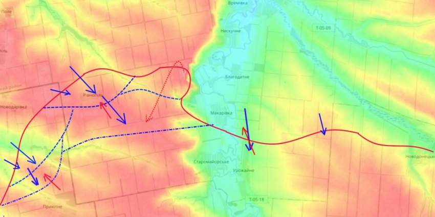 Несколько дней к ряду он атакует на Великоновоселовском направлении, где сумел накануне взять несколько наших позиций на высотах, а ночью он попытался было развить свой успех, атаковав н.п. Старомайорское. Эта атака была отбита, но противник, нащупав слабость (а это стык зоны ответственности 5А и ОБТФ «Каскад»), продолжает свои попытки.
