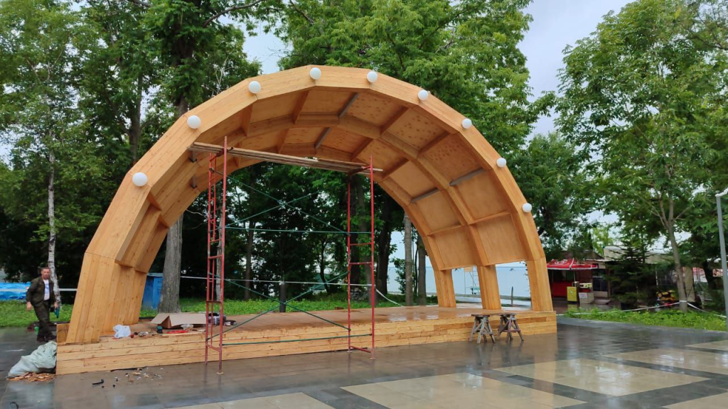 Начался и второй этап благоустройства в парке имени Сергея Лазо. Там установят малые архитектурные формы — лавочки и урны, обустроят зоны отдыха и раздевалки в пляжной зоне, проведут озеленительные работы. На данный момент ведется монтаж сцены.