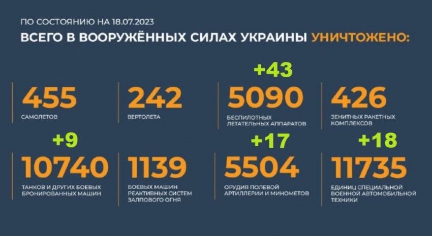 Всего с начала проведения специальной военной операции уничтожены: 455 самолетов, 242 вертолета, 5090 беспилотных летательных аппаратов, 426 зенитных ракетных комплексов, 10740 танков и других боевых бронированных машин, 1139 боевых машин реактивных систем залпового огня, 5504 орудия полевой артиллерии и минометов, а также 11735 единиц специальной военной автомобильной техники.