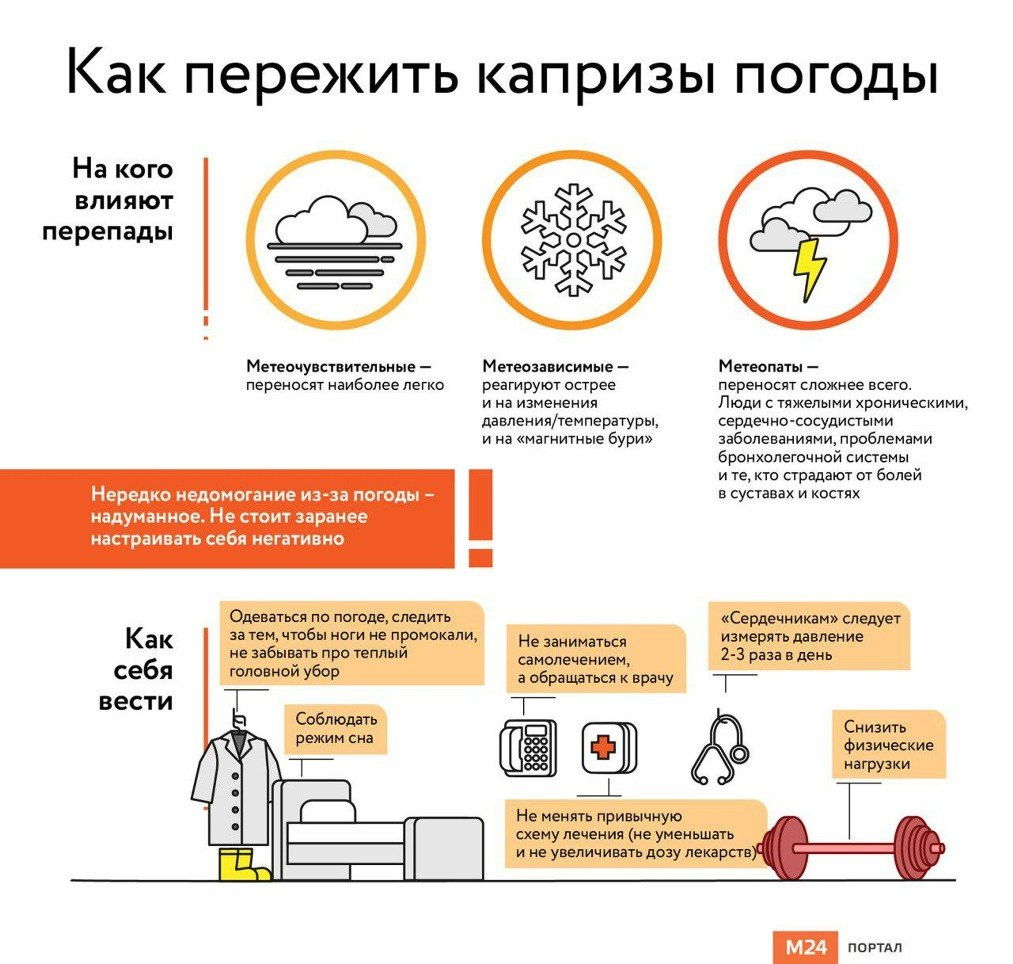 «Таким пациентам стоит обсудить свою реакцию на погоду с врачом - возможно, потребуется коррекция имеющегося лечения или назначение дополнительных препаратов, которые помогут скомпенсировать такую реакцию организма», - цитирует специалиста RT.
