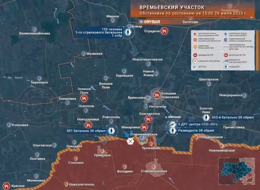 Карта боевых действий на Украине по состоянию на 29.07.2023: обстановка на Времьевском участке