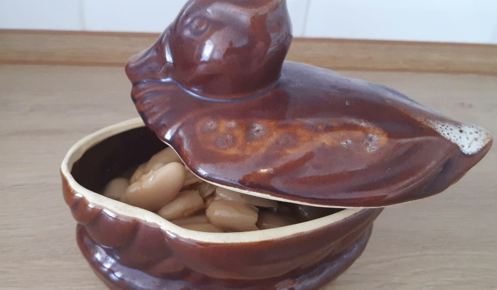 В горшок выкладываем фасоль, добавляем кубик куриного бульона, наливаем ⅓ стакана воды.