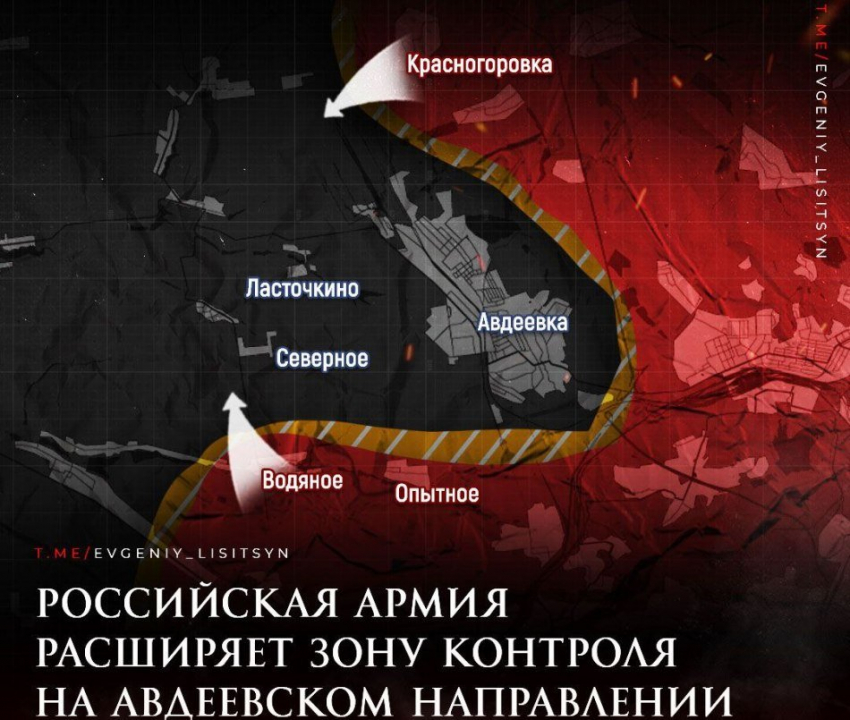 Вооружённые силы Российской Федерации (ВС РФ) за минувшие сутки продвинулись на Авдеевском направлении. Это видно на карте боевых действий. Окружение города Авдеевка продолжается и с каждым днём шансы украинской стороны на удержание города снижаются.