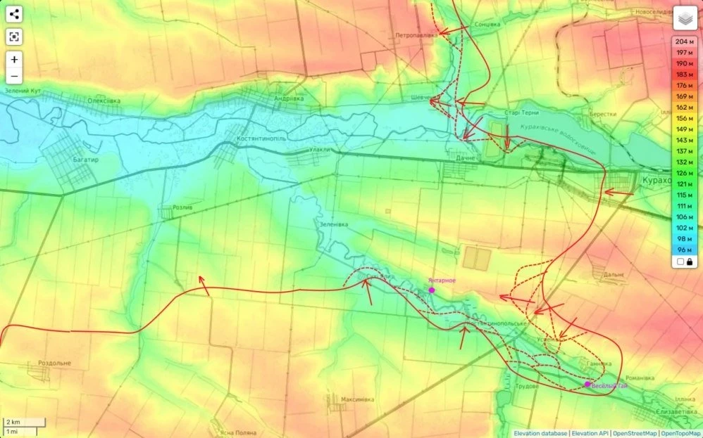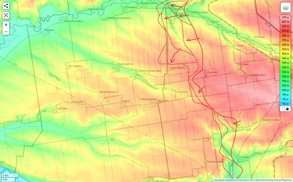 В северной части данного участка мы ведем наступление южнее реки Солёная с задачей обеспечения левого фланга главного удара группировки «Центр», наступающей в обход Покровска. Наше движение здесь идет довольно широким фронтом между Нововасильевкой и Новоелизаветовкой.