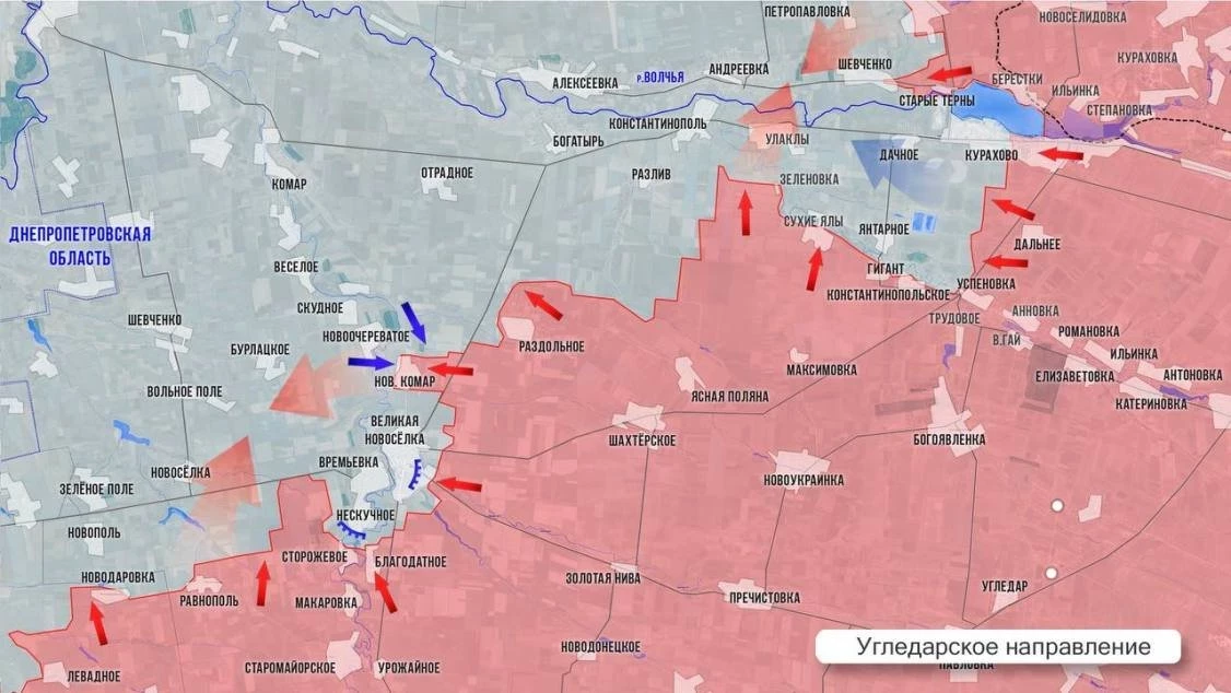 Угледарское направление. В августе и сентябре наши войска продвигались темпами, невиданными с 2022 года. И в итоге самым значимым событием на этом направлении стало освобождение Угледара 3 октября. ВСУ превратили этот город на возвышенности в крепость, а бои за него шли два года. Сражение за Угледар стало одним из самых тяжёлых в истории СВО, потребовало не только серьёзных ресурсов, но и переосмысления тактики боевых действий. Благодаря этой победе Южный фронт на Донбассе сдвинулся: был уничтожен Угледарский плацдарм ВСУ, а также отодвинут фронт от мирного Донецка. При этом армия России восстановила Времевский выступ (сейчас нашим осталось дожать Нескучное), осуществила охват Большой Новосёлки, сформировала «большой кураховский карман» и давит на оставшиеся рубежи в Курахово с юга - освобождено около 90% территории, враг выбит из восточной, южной и центральной частей, бои идут на территории ТЭС.