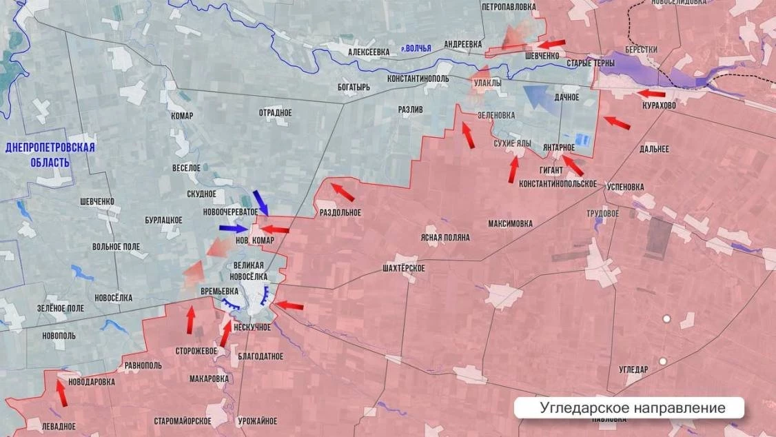 На Угледарском фронте есть новые успехи ВС РФ в районе Времевки. Наши продвинулись вдоль главной улицы села - Партизанской и забили клин в оборону противника. Эта улица выходит к мосту, разделяющему Времевку и Великую Новоселку, то есть, блокирует все выезды из поселка. Времевка еще не под нашим контролем, но Великая Новоселка уже по сути в окружении. Вариантов вывести гарнизон у ВСУ уже не осталось, разве что пойдут по самой большое речке Мокрые Ялы. Хотя и это им может не помочь: по оперативным данным, штурмовики в районе Нового Комара вышли к берегу и укрепляют там плацдарм. В районе Кураховского котла ВС РФ закрепились на восточной и юго-восточной окраинах Дачного. В районе Сухих Ялов, Янтарного и Зеленовки армия России продвигается на север. Авиаударом сильно поврежден мост между Константинополем и Улаклы, что должно усугубить положение ВСУ внутри этого котла.