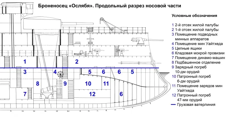 Схема №3. Броненосец «Ослябя». Продольный разрез носовой части