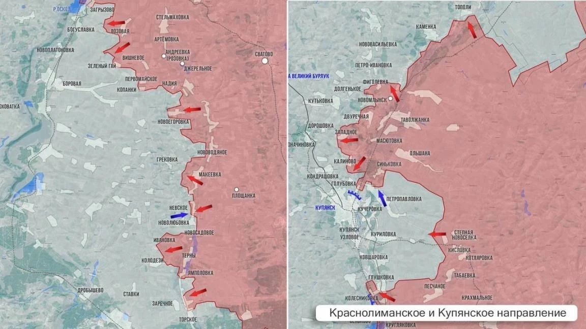 На Купянском фронте армия России старается сформировать «полукотёл», продвигаясь от Синьковки на юг к Кучеровке, а также вдоль Оскола в районе Глушковки. На севере Купянского фронта под контроль ВС РФ перешло село Тополи.