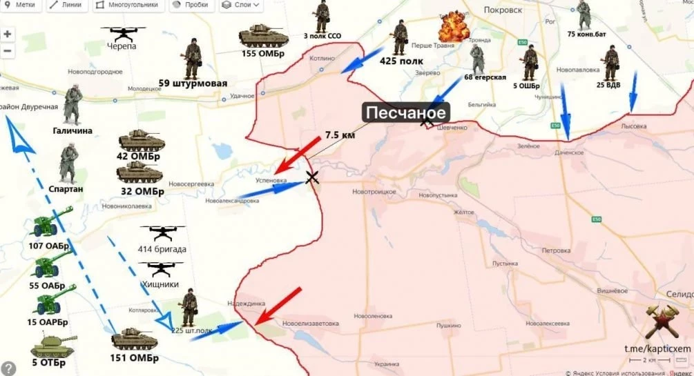На Покровском фронте ВС РФ продвигаются западнее линии Славянка-Петропавловка. От освобожденной Надеждинки атакуют на юг и на запад. Идут ожесточенные бои в Успеновке. После оперативной паузы ВС РФ атакуют в районе Удачного. Несмотря на стянутые резервы и мощные атаки, ВСУ не удалось оттеснить наши войск от южных окраин Покровска и выбить с занятых позиций в Песчаном, Удачном и Котлино. В последнем ВС РФ контролируют ряд важных высот, ограничивая манёвренность ВСУ. Возобновился штурм Лысовки — наши закрепились в южной части, выдавливают ВСУ из северной. На восточном охвате Покровска российские штурмовики работают в Тарасовке. Враг активизировался в районе Новой Полтавки и Зелёного Поля, увидев опасность наших атак, нацеленных из района Зелёного Поля на северо-восток в направлении Александрополя. Если армия России начнет движение со стороны Торецка, то вся группировка украинской армии севернее Новокалиново и Новобахмутовки попадёт в окружение, если не успеет отойти к Константиновке.