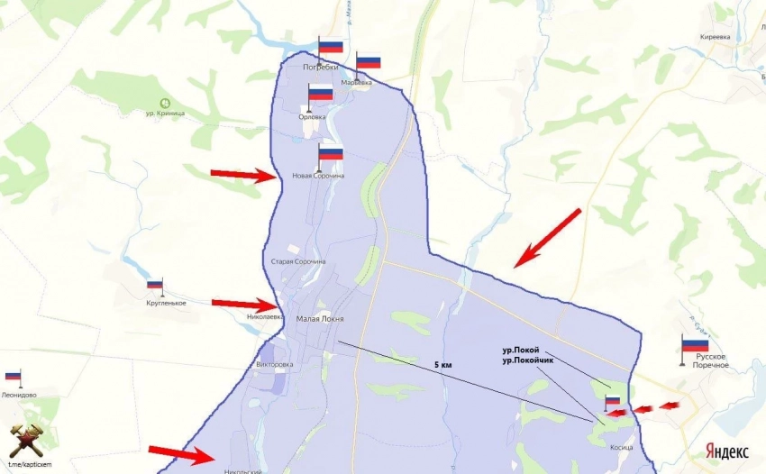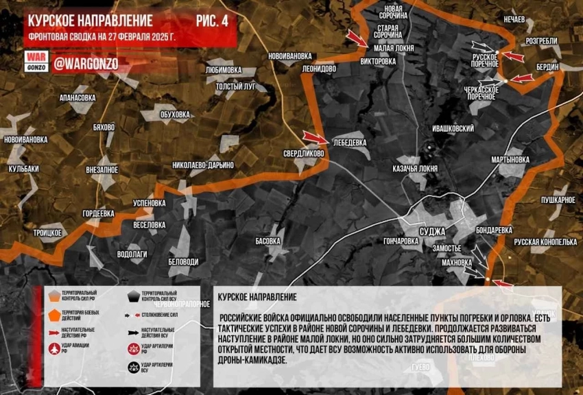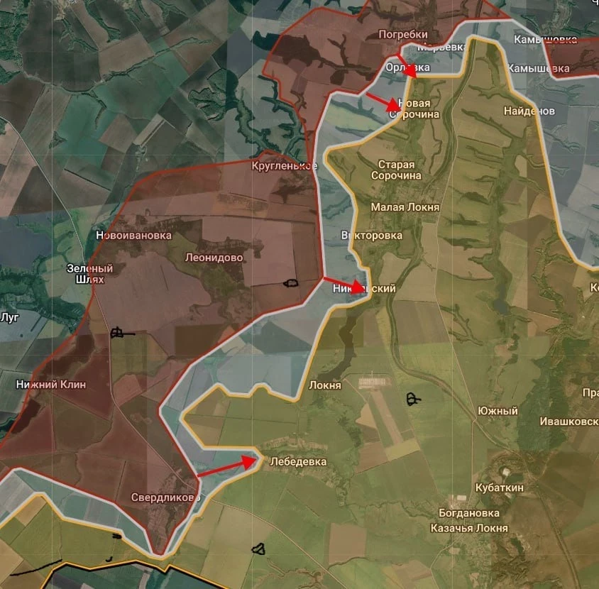 «Российские штурмовики подошли вплотную к Викторовке и Николаевке, но наиболее значительные успехи наблюдаются к северу. Еще вчера [25 февраля] в Сети появились кадры с флагами России <...> над школой в Погребках и пошли сообщения об освобождении Орловки. 26 февраля в Минобороны России официально сообщили об освобождении этих населенных пунктов. Помимо этого, несколько дней назад была освобождена Марьевка, однако этот населенный пункт часто считают частью Погребков. [ВС РФ] атаковали со стороны балки Ольха в направлении Новой Сорочины и к середине дня освободили половину населенного пункта. Сегодня бои продолжаются», - пишут авторы.
