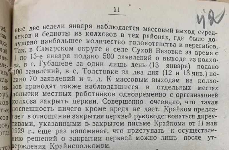 Но по документам пензенского партархива выходит, что бегство из колхозов началось уже в январе 1930 года. То есть получается так, что 27 декабря 1929 года Генеральный секретарь ЦК ВКП(б) Иосиф Сталин на Всесоюзной конференции аграрников-марксистов произнес программную речь «К вопросам аграрной политики в СССР», в которой объявил о начале развертывания сплошной коллективизации сельского хозяйства и переходе «от политики ограничения эксплуататорских тенденций кулачества» к «политике ликвидации кулачества как класса», и сразу же по стране начали образовываться колхозы. А уже в январе… народ из них побежал. Как-то всё очень быстро совершилось, не так ли? Или же, напротив, в колхозы начали набирать еще до выступления Сталина на этой конференции, но сразу же после нее начался отток. Интересно, с чем это было связано…