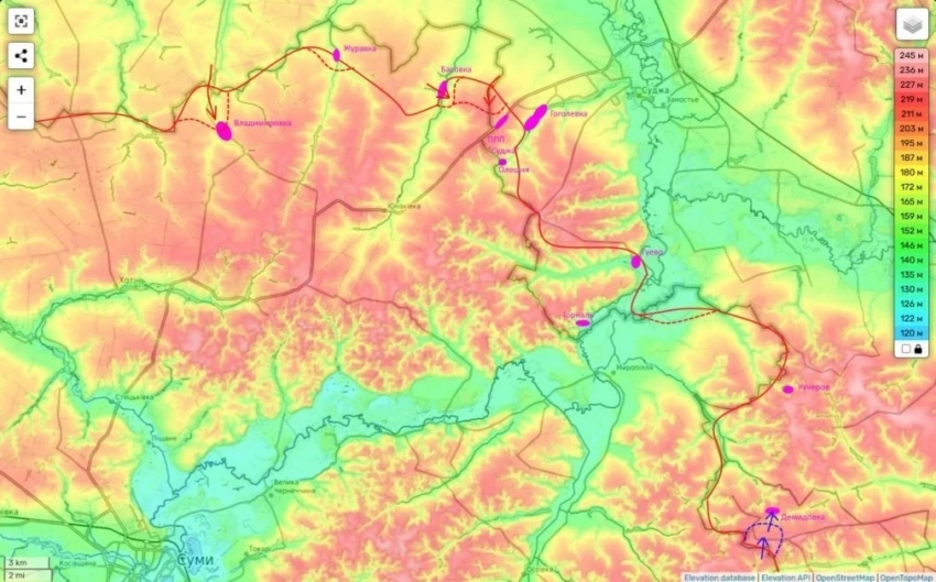 Подоляка констатировал, что ВС РФ усиливают давление на украинскую армию на границе с Сумской областью. В частности, утром 24 марта бойцам удалось продвинуться к ППП «Суджа» и практически взять под контроль Басовку. В случае успеха маневра ВСУ окажутся в невыгодном положении на окраине Гоголевки и в Олешне.