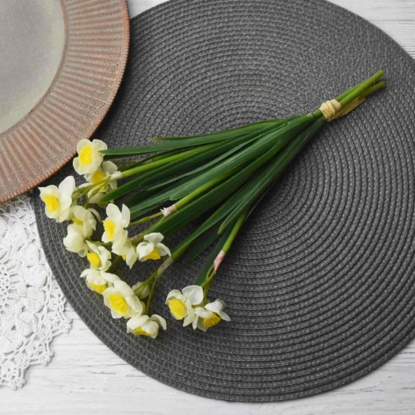 Кустик нарциссов из силикона бело-желтого цвета — это премиум-цветы, которые выглядят максимально натурально и станут прекрасным акцентом в любом интерьере. Высота растения составляет всего 30 см, а в букете 18 соцветий диаметром 3,5 см, что делает его особенно пышным и выразительным. Эти искусственные нарциссы не только создадут весеннее настроение, но и идеально подойдут для украшения домов, офисов или мероприятий. Они не требуют особого ухода, не боятся влаги и мороза, сохраняя свой внешний вид и текстуру на долгое время. В случае повреждения при транспортировке, их легко привести в первоначальное состояние благодаря металлическому стержню внутри стебля. Также они могут быть использованы для создания флористических композиций или декоративных аксессуаров, таких как венки или броши.