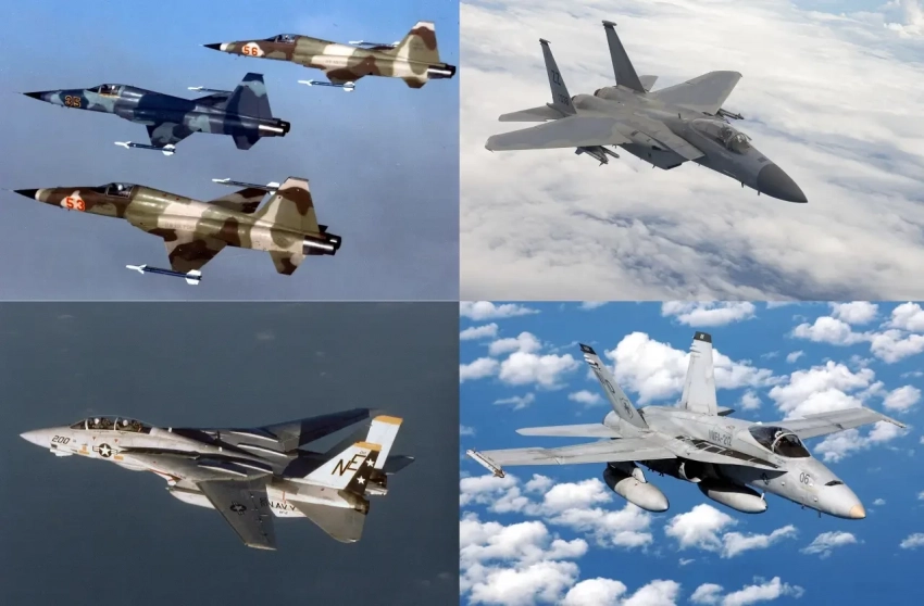 По часовой стрелке – F-5E, F-15, F/A-18, F-14