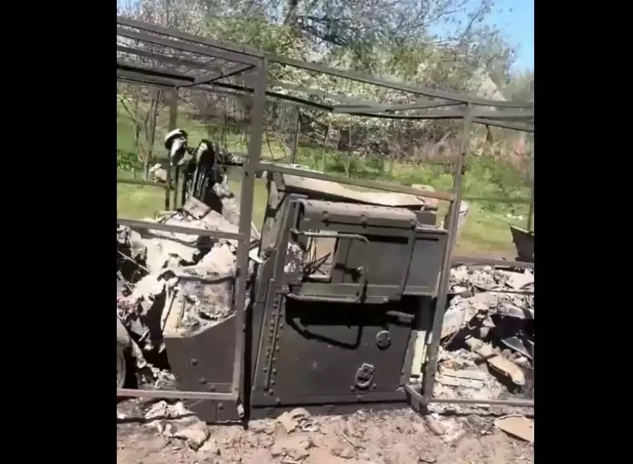 От броневика, на котором перемещались ВСУ, практически ничего не осталось. Он сгорел дотла. Уцелел разве что противодронный «мангал», который, очевидно, со своей задачей не справился.