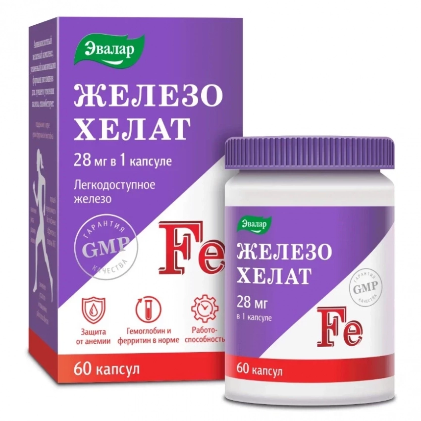 - Хелатная форма железа — высокая усвояемость и минимум побочных эффектов