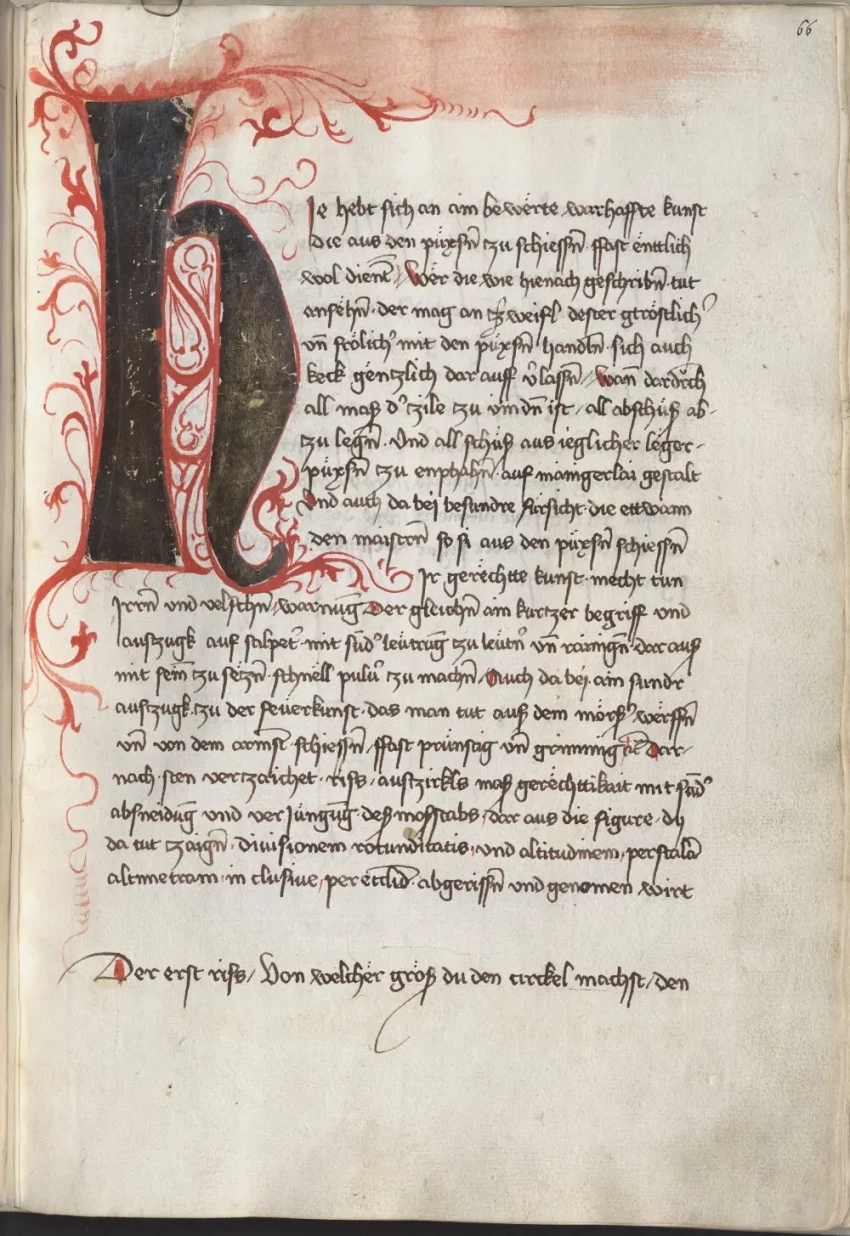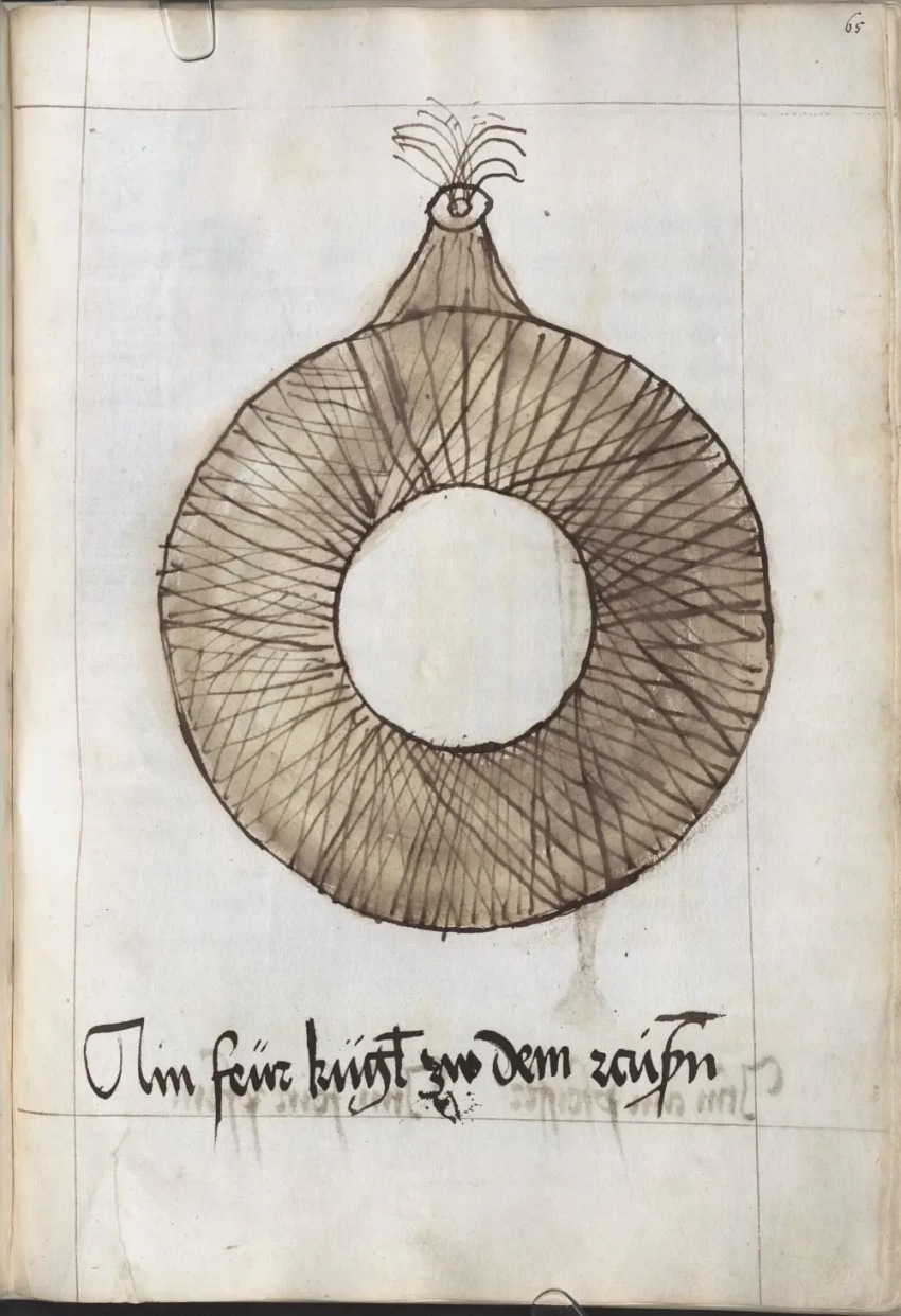 О самом авторе известно, что в 1460 году Мартин Мерц поступил на службу в качестве оружейника ко двору курфюрста Пфальца Фридриху I Победоносному (имел он и прозвище «Злой Фриц», и, видно, недаром), а спустя девять лет смог сделаться главным оружейником его армии. Когда Фридрих I умер в 1476 году, Мерц продолжил свою службу при курфюрсте Филиппе. А еще Мартин Мерц работал с металлом: усовершенствовал ряд составных частей моделей пистолетов, с успехом отливал орудийные стволы и одновременно трудился над своей книгой «Feuerwerksbuch» («Книгой фейерверков»). Других книг он не написал, но зато в этой уровень своего времени отразил очень четко, указав вдобавок еще и на ряд важных принципов конструирования порохового оружия. Итак, будем перелистывать самые интересные страницы этой книги и рассматривать то, что на них изображено.